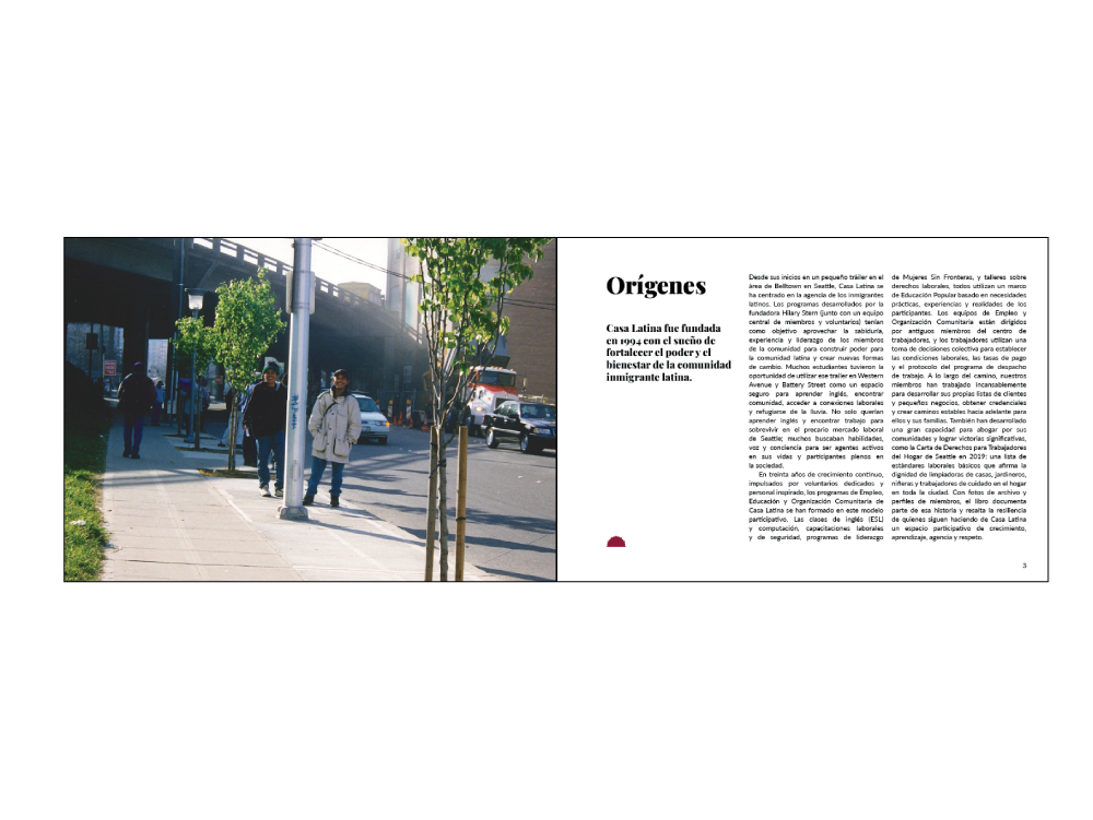 To commemorate Casa Latina’s 30-year anniversary, a book was developed in collaboration with Humanities Washington and graduate students at the University of Washington’s School. This project presented the opportunity to not only document the organization’s milestones but also share the powerful stories of its members.